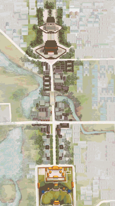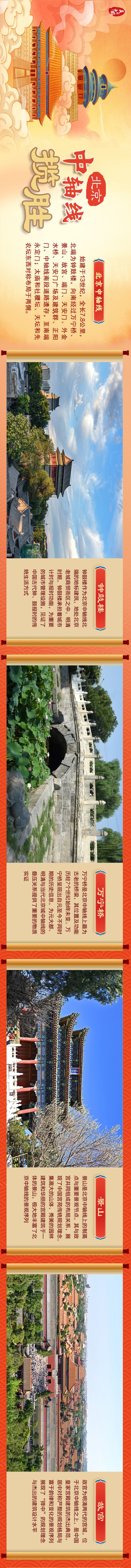 全長(zhǎng)7.8公里的北京中軸線北端為鐘鼓樓,向南經(jīng)過萬寧橋、景山、故宮、端門、天安門、外金水橋、天安門廣場(chǎng)及建筑群、正陽(yáng)門、中軸線南段道路遺存,至南端永定門;太廟和社稷壇、天壇和先農(nóng)壇東西對(duì)稱布局于兩側(cè)。
