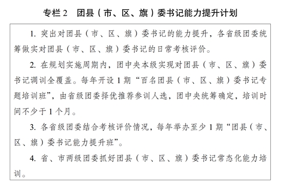 (二)突出“關鍵少數(shù)”政治訓練。堅持把政治訓練貫穿團干部成長全周期,使團干部的政治素養(yǎng)、政治能力與擔負的領導職責相匹配。強化“一把手”政治培訓,有計劃地選調團的各級領導機關主要負責同志到團干部教育培訓機構參加專題培訓。強化對團縣(市、區(qū)、旗)委書記這一群體的培訓,實施團縣(市、區(qū)、旗)委書記能力提升計劃(專欄2)。突出對團的領導機關干部的政治訓練,各級團的領導機關加強對機關干部的常態(tài)化政治能力培訓。加強對青年人才的政治引領,團中央組織部會同有關單位每年組織一定數(shù)量青年人才開展國情研修。積極推動將地方團的領導機關班子成員培訓納入地方黨委組織開展的干部政治理論培訓范疇。