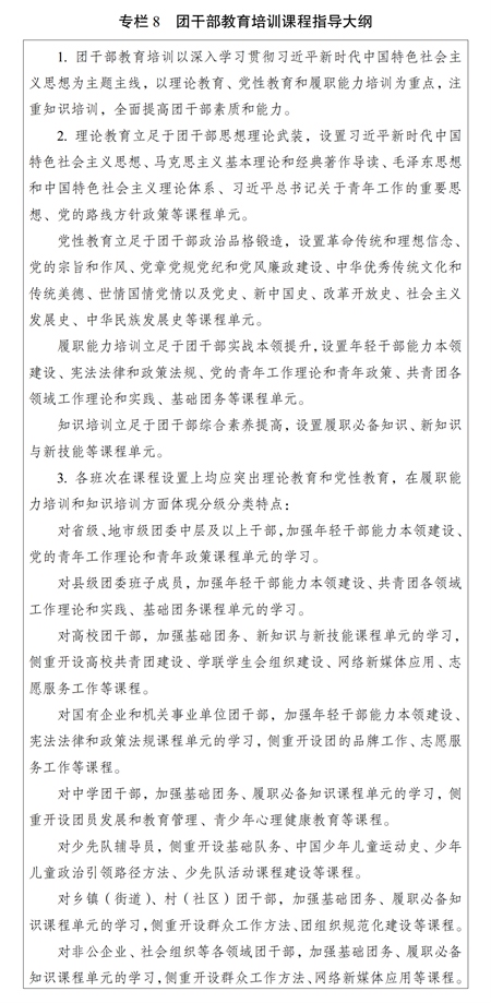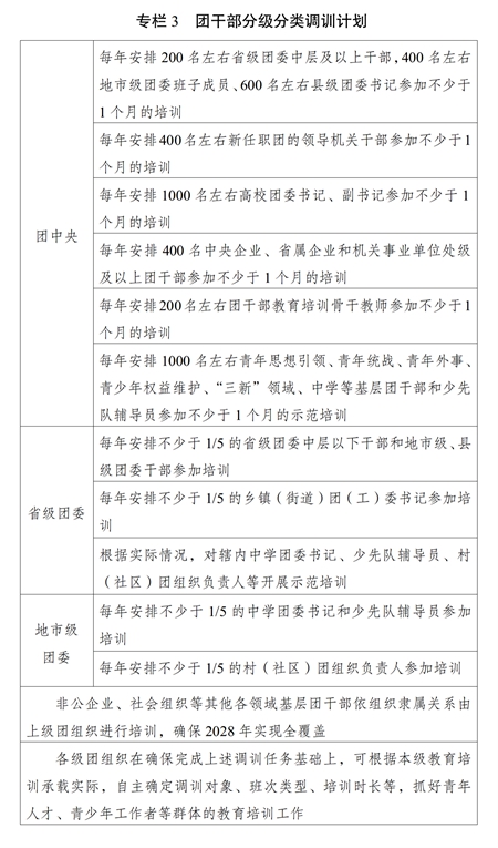 ?。ǘ﹫猿址旨壏诸?。根據(jù)各級團的領導機關干部、高校團干部、國有企業(yè)和機關事業(yè)單位單位團干部、中學團干部、鄉(xiāng)鎮(zhèn)(街道)團(工)委書記、村(社區(qū))團組織負責人、非公企業(yè)、社會組織等其他各領域基層團干部的不同對象特點,把團干部履職能力培訓的普遍性要求與不同類別、不同層級、不同崗位團干部的特殊需要結合起來,整合優(yōu)質資源,加強團干部教育培訓機構與黨校(行政學院)、干部學院、黨性教育基地等的合作聯(lián)動,多渠道多方面開展履職能力培訓,切實增強教育培訓的時代性、系統(tǒng)性、針對性、有效性。發(fā)揮中央團校、全國青少年井岡山革命傳統(tǒng)教育基地主體作用,圍繞黨的中心任務、黨中央重大決策部署和國家重大戰(zhàn)略需求開展專題培訓;發(fā)揮全國團干部教育培訓基地優(yōu)勢,開展政策解讀、重點任務落實等專題培訓;發(fā)揮地方團干部教育培訓機構優(yōu)勢,開展基層團干部實務培訓;發(fā)揮全國團干部教育培訓網絡平臺作用,抓好履職通識培訓;加強與派出單位、接收單位的協(xié)作,抓好援派幫扶干部人才、掛職干部等教育培訓。積極創(chuàng)造條件,支持干部在職自學。實施團干部分級分類調訓計劃(專欄3)。