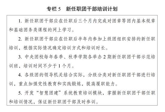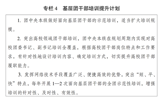 ?。ㄈ┩怀鰧崙?zhàn)實效。強化基層導向,把準培訓需求,加強培訓設計,選優(yōu)配強師資,綜合運用多種方式方法開展實戰(zhàn)化培訓,實施基層團干部培訓提升計劃(專欄4)。堅持“干而論道”,注重邀請領導干部、專家學者、基層團干部、先進青年典型等授課,讓懂政策的人講政策、有經驗的人談經驗、會方法的人教方法。團的領導機關要加強對邊疆地區(qū)、鄉(xiāng)村振興重點幫扶地區(qū)團干部教育培訓支持力度。強化專業(yè)導向,針對青年思想引領、青年統(tǒng)戰(zhàn)、青年外事、青少年權益維護、“三新”領域、中學等類別團干部和少先隊輔導員開展專題培訓,緊貼業(yè)務實操,加大案例教學比重,把實踐中鮮活生動的案例及時運用到教育培訓中。運用情景模擬、桌面推演、工作復盤等方法,讓團干部在仿真情境中學習如何處理問題、化解矛盾、防范風險。探索把課堂搬到基層一線和普通青年中去,讓團干部在實踐中學習掌握開展調查研究、密切聯(lián)系青年、做好群眾工作的方式方法,提升解決實際問題的能力本領。加強案例開發(fā)和實訓室建設。實施新任職團干部培訓計劃(專欄5)。