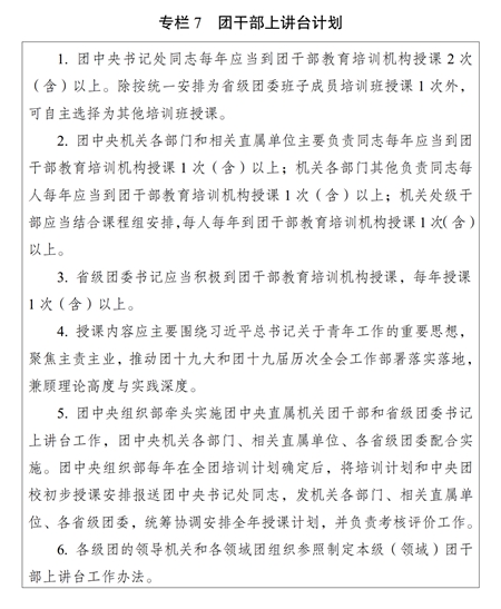 ?。ǘ熧Y隊伍建設。加大名師培養(yǎng)引進力度,把團干部教育培訓師資納入各級青年人才政策支持范疇,努力造就一批對黨忠誠、精通黨的創(chuàng)新理論、授課水平高、在學科領域有影響力的知名教師。加強師資隊伍黨性教育和業(yè)務培訓,完善專職教師通過列席會議、基層調研、掛職鍛煉等方式促進知識更新、加深理論研究。通過“名師帶徒”等方式,加強中青年骨干教師培養(yǎng)。大力推進團干部上講臺,實施團干部上講臺計劃(專欄7)。注重在領導干部、先進青年典型、優(yōu)秀基層團干部中遴選培養(yǎng)師資。分級建設師資庫。探索建立符合團干部教育培訓特點的師資隊伍考核評價體系。