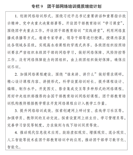?。ǘ┘訌娋W絡培訓課程建設。鼓勵團干部教育培訓機構開發(fā)精品網絡課程。注重把握網絡教學特點和規(guī)律,改進授課方式,提高制作水平,豐富呈現(xiàn)形式,提升課程質量。嚴把網絡課程政治關、質量關,規(guī)范講授、制作、審核、發(fā)布和更新、退出流程。充分發(fā)揮網絡培訓優(yōu)勢,推動優(yōu)質資源下基層。用好網絡直播培訓形式,增強現(xiàn)場體驗感。實施團干部網絡培訓提質增效計劃(專欄9)。