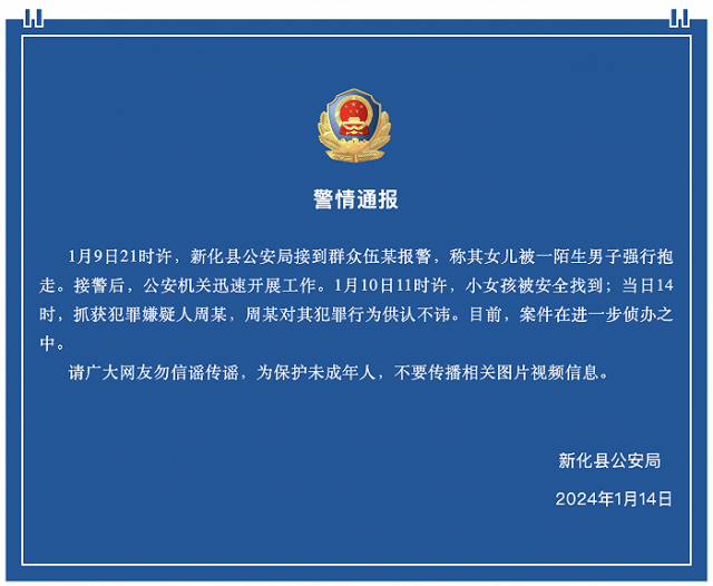 央視網(wǎng)消息:據(jù)“新化公安”公眾號(hào)消息,湖南新化縣公安局1月14日晚發(fā)布警情通報(bào),1月9日21時(shí)許,新化縣公安局接到群眾伍某報(bào)警,稱(chēng)其女兒被一陌生男子強(qiáng)行抱走。接警后,公安機(jī)關(guān)迅速開(kāi)展工作。1月10日11時(shí)許,小女孩被安全找到;當(dāng)日14時(shí),抓獲犯罪嫌疑人周某,周某對(duì)其犯罪行為供認(rèn)不諱。目前,案件在進(jìn)一步偵辦之中。