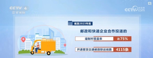 數(shù)據(jù)顯示,截至2023年底,中國(guó)郵政建成1061個(gè)縣、6010個(gè)鄉(xiāng)鎮(zhèn)的郵政處理中心和40萬個(gè)郵政及郵樂購(gòu)村級(jí)站點(diǎn),郵政和快遞企業(yè)合作投遞的建制村覆蓋率達(dá)75%,開通客貨交通郵政聯(lián)運(yùn)線路4115條。