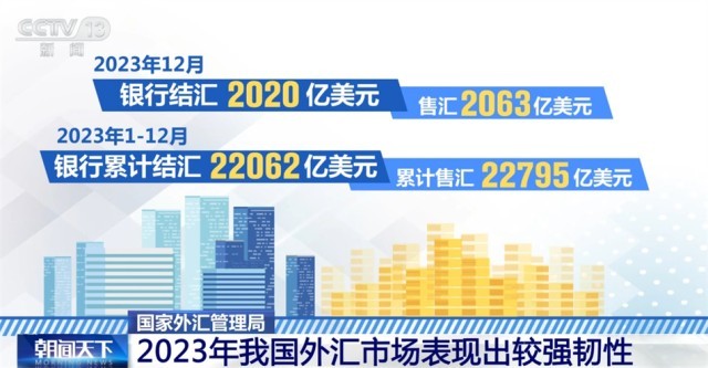 國家外匯管理局最新數(shù)據(jù)顯示,2023年12月,銀行結(jié)匯2020億美元,售匯2063億美元。2023年1—12月,銀行累計(jì)結(jié)匯22062億美元,累計(jì)售匯22795億美元。