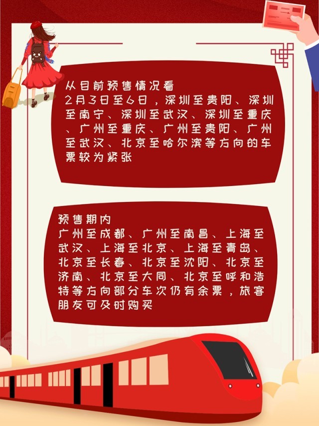 從目前預(yù)售情況看,2月3日至6日,深圳至貴陽(yáng)、深圳至南寧、深圳至武漢、深圳至重慶、廣州至重慶、廣州至貴陽(yáng)、廣州至武漢、北京至哈爾濱等方向的車(chē)票較為緊張。預(yù)售期內(nèi),廣州至成都、廣州至南昌、上海至武漢、上海至北京、上海至青島、北京至長(zhǎng)春、北京至沈陽(yáng)、北京至濟(jì)南、北京至大同、北京至呼和浩特等方向部分車(chē)次仍有余票,旅客朋友可及時(shí)購(gòu)買(mǎi)。