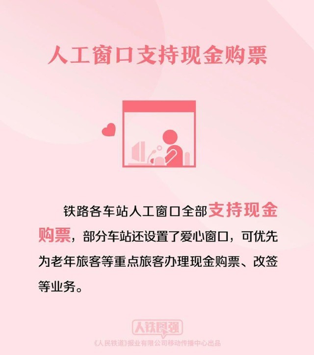 鐵路各車(chē)站人工窗口全部支持現(xiàn)金購(gòu)票,部分車(chē)站還設(shè)置了愛(ài)心窗口,可優(yōu)先為老年旅客等重點(diǎn)旅客辦理現(xiàn)金購(gòu)票、改簽等業(yè)務(wù)。