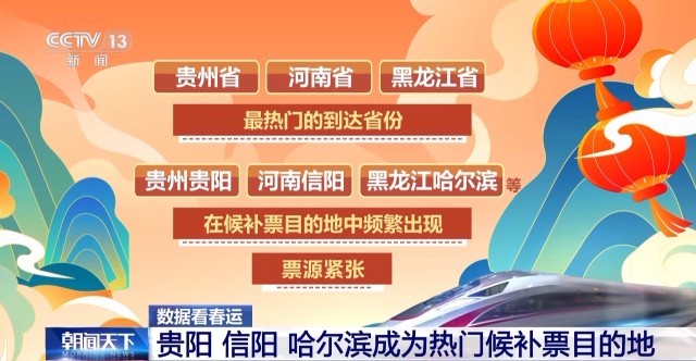 貴州省、河南省、黑龍江省是最熱門(mén)的到達(dá)省份。貴州貴陽(yáng)、河南信陽(yáng)、黑龍江哈爾濱等在候補(bǔ)票目的地中頻繁出現(xiàn),票源緊張。