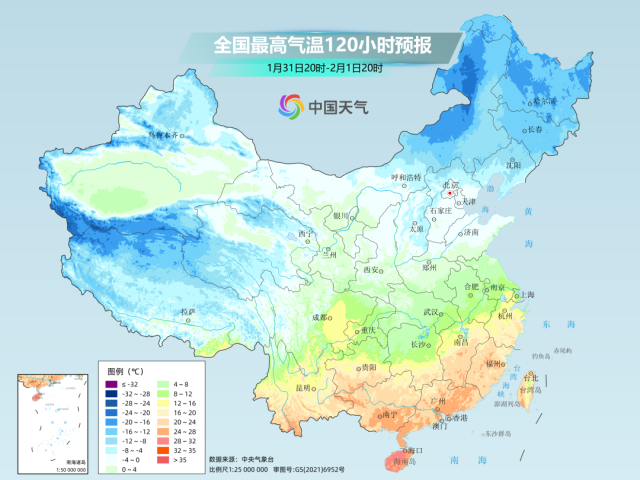 1月31日至2月1日,南方暖熱將達到階段性高點,屆時最高氣溫20℃線將北抬至江南中部,華南不少地方最高氣溫將超過25℃。