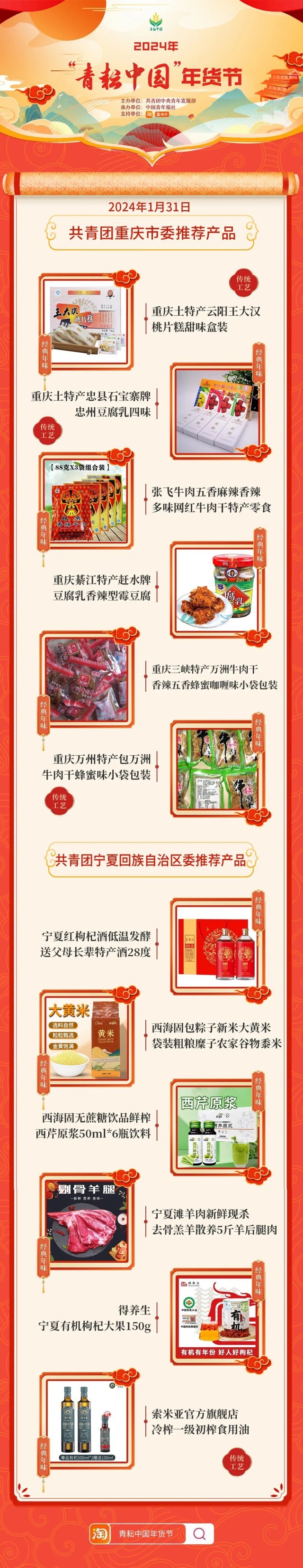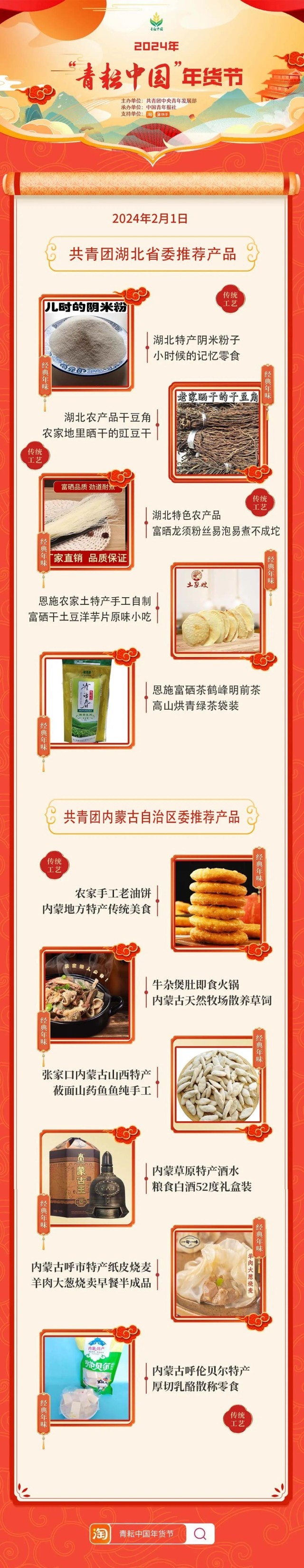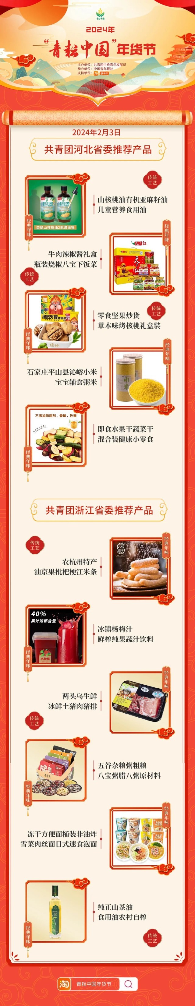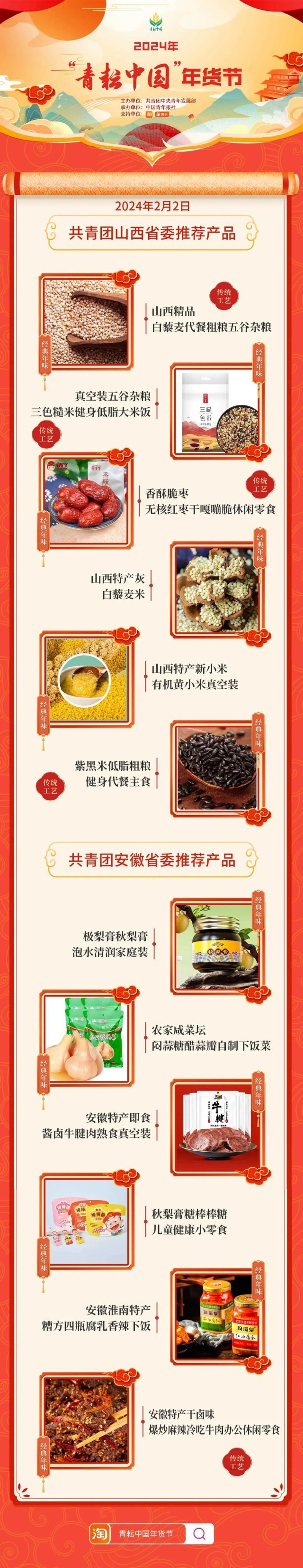 2024年“青耘中國”年貨節(jié)將于1月31日至2月24日,開展“一日兩省”主題日活動(dòng)。用戶可在淘寶APP搜索“青耘中國年貨節(jié)”進(jìn)入專題頁選購產(chǎn)品。