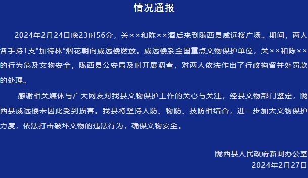 2024年2月24日晚23時(shí)56分,關(guān)××和陳××酒后來(lái)到隴西縣威遠(yuǎn)樓廣場(chǎng)。期間,兩人各手持1支“加特林”煙花朝向威遠(yuǎn)樓燃放。威遠(yuǎn)樓系全國(guó)重點(diǎn)文物保護(hù)單位,關(guān)××和陳××的行為危及文物安全,隴西縣公安局及時(shí)開展調(diào)查,對(duì)兩人依法作出了行政拘留并處罰款的處理。