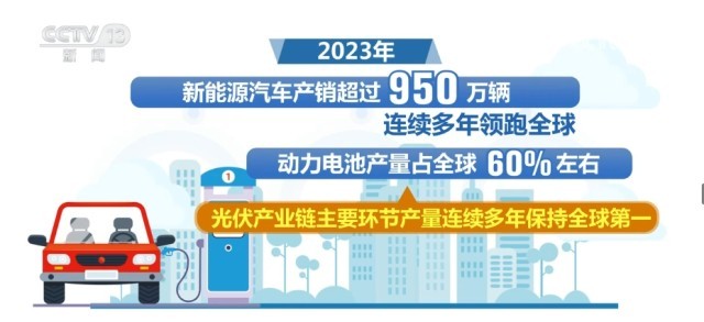 2023年,我國高技術(shù)制造業(yè)、裝備制造業(yè)增加值占規(guī)模以上工業(yè)增加值比重分別達到15.7%和33.6%。新能源汽車產(chǎn)銷超過950萬輛,連續(xù)多年領(lǐng)跑全球,動力電池產(chǎn)量占全球60%左右,光伏產(chǎn)業(yè)鏈主要環(huán)節(jié)產(chǎn)量連續(xù)多年保持全球第一。