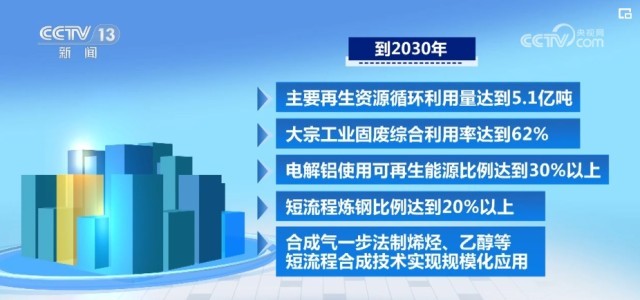 《指導意見》提出,到2030年,主要再生資源循環(huán)利用量達到5.1億噸,大宗工業(yè)固廢綜合利用率達到62%,電解鋁使用可再生能源比例達到30%以上,短流程煉鋼比例達到20%以上,合成氣一步法制烯烴、乙醇等短流程合成技術(shù)實現(xiàn)規(guī)?;瘧谩?/p>