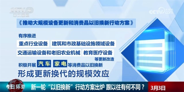 央視網(wǎng)消息:日前,國務院常務會議審議通過了《推動大規(guī)模設備更新和消費品以舊換新行動方案》。行動方案有哪些亮點?新一輪“以舊換新”和以往有什么不同?來看專家的解讀。