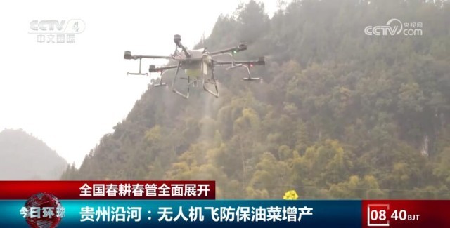 在貴州沿河,農技人員組織專業(yè)飛手進行無人機統防統治作業(yè),確保油菜增產增收。