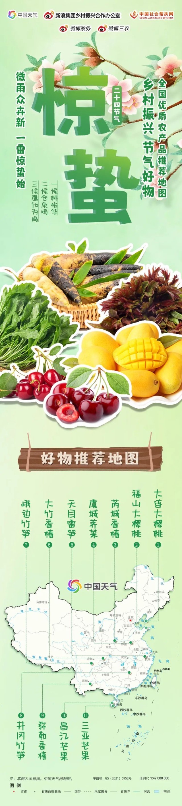在這個(gè)春雷乍響,萬物生長的節(jié)氣里,又有哪些春季的舌尖美味呢,來看看由中國天氣網(wǎng)、中國社會(huì)幫扶網(wǎng)聯(lián)合推出的“鄉(xiāng)村振興·節(jié)氣好物”全國優(yōu)質(zhì)農(nóng)產(chǎn)品推薦地圖驚蟄篇吧!