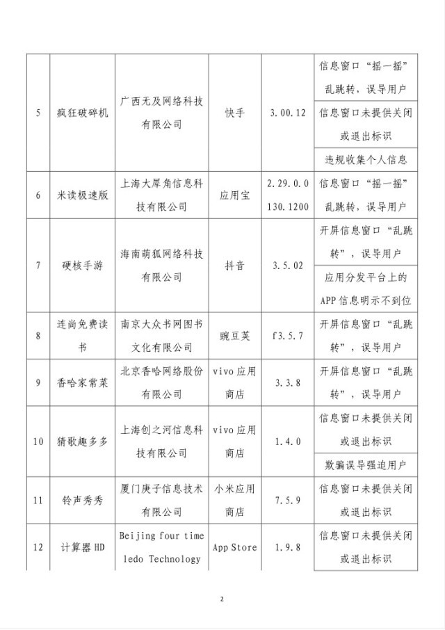 央視網(wǎng)消息:據(jù)工業(yè)和信息化部網(wǎng)站消息,工業(yè)和信息化部信息通信管理局3月14日公布《關(guān)于侵害用戶權(quán)益行為的APP(SDK)通報(2024年第2批,總第37批)》:
