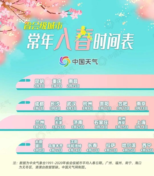 常年3月,是我國(guó)入春最集中的一段時(shí)間,此時(shí)往往有15個(gè)省會(huì)級(jí)城市完成冬春轉(zhuǎn)換。3月上旬,成都、長(zhǎng)沙、武漢、杭州等地率先進(jìn)入氣象學(xué)意義上的春天;3月中旬,貴陽(yáng)、合肥、南京、上海、鄭州、西安等地邁入春天的門(mén)檻;3月下旬,華北、黃淮一帶的石家莊、濟(jì)南、北京、天津等地也投入春的懷抱。