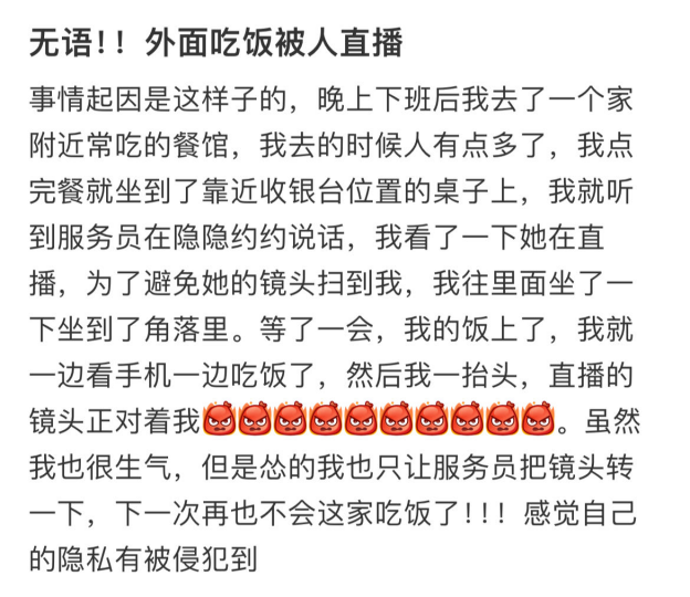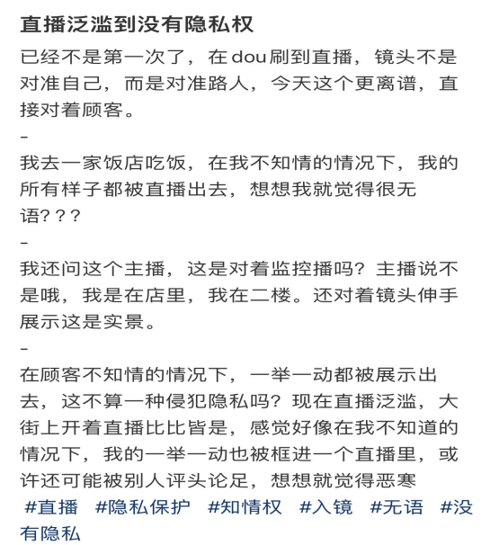 據媒體報道,近期,陜西西安兩名老人用餐時被商家拍下視頻,之后商家又私自將拍攝內容發(fā)到網上,老人親戚無意刷到視頻才發(fā)現(xiàn)。在老人家屬與其多次溝通后,商家刪除了視頻。消費者多在不知情或者未被征詢意見的情況下被動充當商家直播或者拍攝短視頻的引流工具,除了自己的言行舉止可能被迫接受他人的凝視和審判外,還有面部信息泄露風險。
