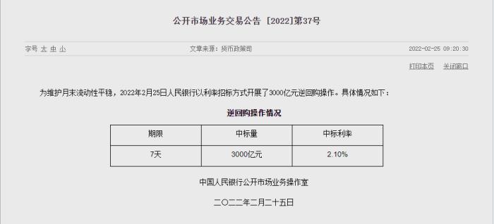 中新財經(jīng)2月25日電 中國人民銀行官網(wǎng)25日消息,為維護(hù)月末流動性平穩(wěn),2022年2月25日人民銀行以利率招標(biāo)方式開展了3000億元逆回購操作。(完)