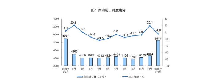 原油生產(chǎn)穩(wěn)定增長,進口由增轉(zhuǎn)降。1—2月份,生產(chǎn)原油3347萬噸,同比增長4.6%,增速比上年12月份加快2.9個百分點,日均產(chǎn)量56.7萬噸。進口原油8514萬噸,同比下降4.9%,上年12月份為增長20.1%。