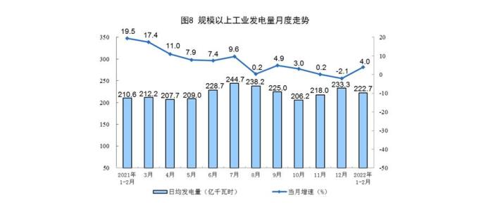 電力生產(chǎn)由降轉(zhuǎn)升。1—2月份,發(fā)電量13141億千瓦時,同比增長4.0%,上年12月份為下降2.1%,日均發(fā)電222.7億千瓦時。