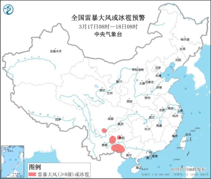 全國(guó)雷暴大風(fēng)或冰雹預(yù)警圖(3月17日8時(shí)-18日8時(shí))