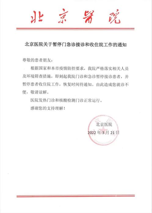 中新網(wǎng)3月21日電 據(jù)北京醫(yī)院微信公眾號21日消息,根據(jù)國家和北京市疫情防控要求,該醫(yī)院嚴格落實相關(guān)人員及環(huán)境篩查措施,即刻起該醫(yī)院門診和急診暫停接診患者,并暫停患者收住院工作,恢復時間另行通知。發(fā)熱門診和核酸檢測門診正常運行。通知如下: