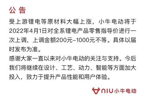 中新財經(jīng)3月21日電 21日,小牛電動發(fā)布公告稱,受上游鋰電等原材料價格大幅上漲,小牛電動將于2022年4月1日對全系鋰電產(chǎn)品零售指導價進行一次上調(diào),上調(diào)金額200-1000元不等,具體以屆時發(fā)布為準。(完)