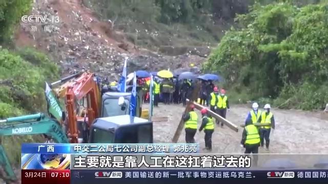 總臺(tái)央視記者 王世玉:我現(xiàn)在的位置是廣西梧州藤縣莫埌村的入口,也是通往事故核心區(qū)的一條必經(jīng)之路。大家看到在我身后的貨車(chē)正在進(jìn)行物資的裝卸,裝卸的物資是竹排。為什么要進(jìn)行竹排的運(yùn)輸呢?因?yàn)?現(xiàn)場(chǎng))從昨天晚上開(kāi)始就一直在降雨,可以看到路面非常泥濘,在核心區(qū)內(nèi)通行更是非常困難。施工人員想到用竹排鋪滿在路面上,方便物資和人員的運(yùn)輸和通行。