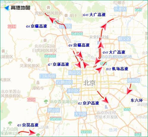4日、5日12至20時(shí),進(jìn)京方向的交通壓力將明顯上升,其中京藏高速八達(dá)嶺、居庸關(guān)、西三旗、北沙灘,京承高速黃港、太陽(yáng)宮,京港澳高速西道口、琉璃河,京開(kāi)高速榆垡、玉泉營(yíng)等路段車流較為集中。