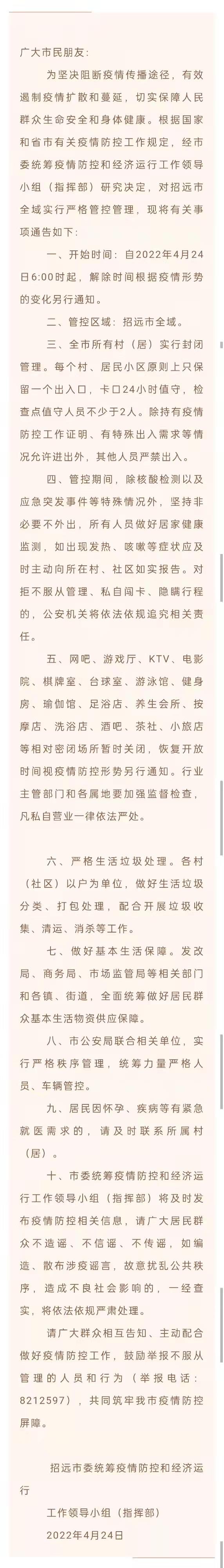 4月24日,山東煙臺招遠(yuǎn)市委統(tǒng)籌疫情防控和經(jīng)濟(jì)運(yùn)行工作領(lǐng)導(dǎo)小組(指揮部)發(fā)布《關(guān)于全域?qū)嵤﹪?yán)格管控管理的通告》。通告指出,自2022年4月24日6時(shí)起,招遠(yuǎn)市所有村(居)實(shí)行封閉管理。每個(gè)村、居民小區(qū)原則上只保留一個(gè)出入口,卡口24小時(shí)值守,檢查點(diǎn)值守人員不少于2人。除持有疫情防控工作證明、有特殊出入需求等情況允許進(jìn)出外,其他人員嚴(yán)禁出入。