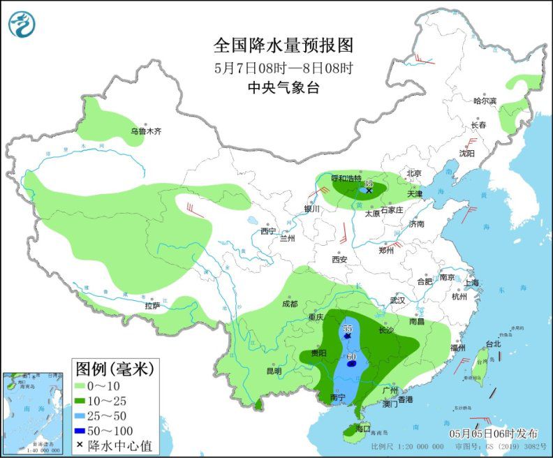 5月7日8時至8日8時,內(nèi)蒙古河套地區(qū)、陜西北部、山西北部、貴州東部和南部、江南西部、華南西部等地的部分地區(qū)有中到大雨,其中,湖南西部、廣西北部等地局地有暴雨(50~60毫米)。內(nèi)蒙古河套地區(qū)、東北地區(qū)南部、陜西北部等地部分地區(qū)有4~6級風(fēng)。