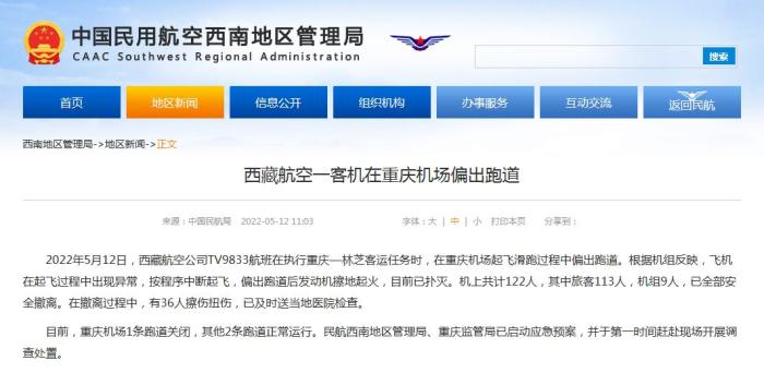 中新網(wǎng)5月12日電 據(jù)民航局網(wǎng)站消息,民航局今日就西藏航空一客機在重慶機場偏出跑道發(fā)布通報。通報稱,2022年5月12日,西藏航空公司TV9833航班在執(zhí)行重慶—林芝客運任務(wù)時,在重慶機場起飛滑跑過程中偏出跑道。根據(jù)機組反映,飛機在起飛過程中出現(xiàn)異常,按程序中斷起飛,偏出跑道后發(fā)動機擦地起火,目前已撲滅。機上共計122人,其中旅客113人,機組9人,已全部安全撤離。在撤離過程中,有36人擦傷扭傷,已及時送當?shù)蒯t(yī)院檢查。
