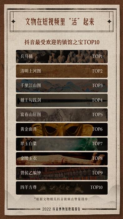 通過抖音平臺的短視頻,觀眾可直接觀賞“鎮(zhèn)館之寶”級別的藏品,與歷史和傳統(tǒng)對話。報告顯示,兵馬俑、《清明上河圖》、《千里江山圖》等入選抖音最受歡迎十大鎮(zhèn)館之寶。真珠舍利寶幢、蓮鶴方壺、象首耳獸面紋銅罍等入選抖音關(guān)注度提升最快的文物前十名。