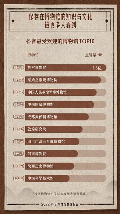 報告顯示,根據(jù)相關(guān)視頻點(diǎn)贊量排序,故宮博物院、秦始皇帝陵博物院、中國人民革命軍事博物館、中國國家博物館、成都武侯祠博物館等入選抖音最受歡迎十大博物館。其中,故宮博物院相關(guān)視頻被抖音網(wǎng)友點(diǎn)贊超過1.3億次。