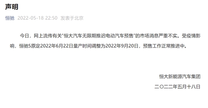 恒大回應(yīng)“無(wú)限期推遲電動(dòng)汽車預(yù)售”:消息不實(shí)