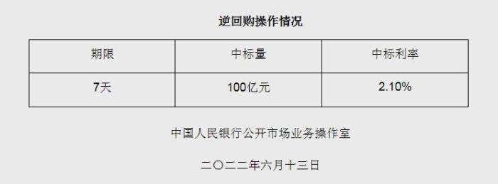 央行6月13日開(kāi)展100億元逆回購(gòu)操作 中標(biāo)利率2.10%