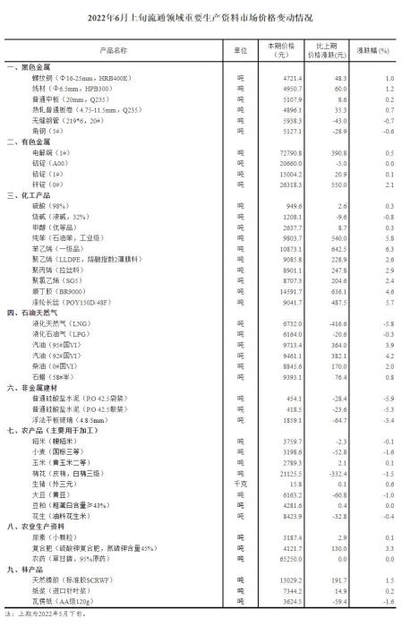 2022年6月上旬流通領(lǐng)域重要生產(chǎn)資料市場價格變動情況。國家統(tǒng)計局網(wǎng)站截圖