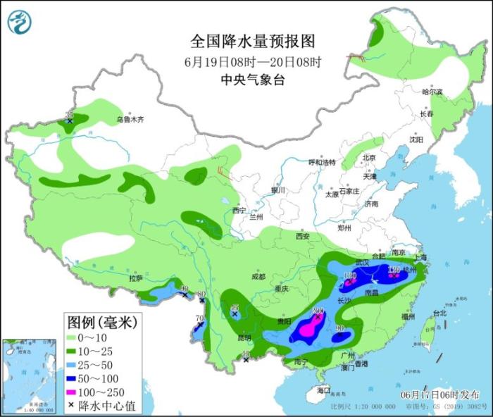 6月19日08時(shí)至20日08時(shí),江淮西南部、江南中北部和西部、華南中西部以及西南地區(qū)南部、西藏東南部等地的部分地區(qū)有中到大雨,其中,貴州東南部、湖北東南部、安徽南部、湖南東北部和中南部、江西北部、浙江中西部、廣西中北部、廣東北部、云南西北部等地部分地區(qū)有暴雨,局地大暴雨(100~200毫米)。內(nèi)蒙古東北部、甘肅西部等地的部分地區(qū)有4~6級風(fēng);北部灣、南海西北部和中西部將有5~6級、陣風(fēng)7級的偏南到西南風(fēng)。