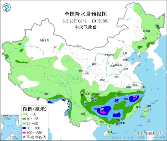 6月17日08時(shí)至18日08時(shí),廣東大部、廣西北部和中東部、福建西部和北部、貴州南部和東部、湖南西部和南部、江西中南部、浙江南部以及云南西北部、西藏東南部等地的部分地區(qū)有大到暴雨,局地大暴雨(100~180毫米)。新疆沿天山地區(qū)和南疆盆地、內(nèi)蒙古中西部、西藏中西部等地的部分地區(qū)有4~6級風(fēng),其中新疆東部部分地區(qū)風(fēng)力可達(dá)7級以上;東海南部、臺(tái)灣以東洋面、北部灣將有5~6級、陣風(fēng)7級的偏南到西南風(fēng)。