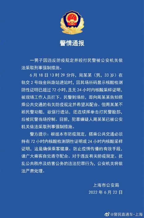 6月18日13時29分許,周某某(男,33歲)在軌交2號線金科路站進(jìn)站時,因其場所碼顯示核酸檢測陰性證明已超過72小時,且無24小時內(nèi)核酸采樣證明,被現(xiàn)場工作人員攔下。民警到場后,即向周某某告知搭乘公共交通的有關(guān)防疫規(guī)定并希望其配合。但周某某不顧民警勸阻,欲強(qiáng)行進(jìn)站,還連續(xù)揮拳擊打民警臉部,后被民警當(dāng)場控制。目前,犯罪嫌疑人周某某已被公安機(jī)關(guān)依法采取刑事強(qiáng)制措施。