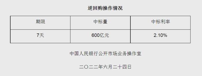 央行6月24日開展600億元逆回購操作 中標利率2.10%