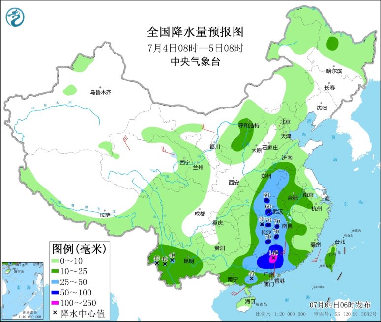 7月4日08時(shí)至5日08時(shí),廣東大部、廣西東部、湖南中東部、江西西部和南部、湖北中部、河南東部等地部分地區(qū)有大到暴雨,其中,廣東北部等地部分地區(qū)有大暴雨(100~140毫米)。內(nèi)蒙古西部、甘肅西部、青海北部、東北地區(qū)南部、江南中部、華南東部等地的部分地區(qū)有4~6級(jí)風(fēng);東海北部海域有6~7級(jí)、陣風(fēng)8級(jí)的旋轉(zhuǎn)風(fēng),東海南部海域、臺(tái)灣海峽、北部灣、南海北部和中部海域有5~6級(jí)、陣風(fēng)7級(jí)的偏南到西南風(fēng)。