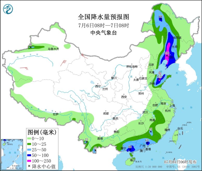 7月6日08時(shí)至7日08時(shí),內(nèi)蒙古東部、黑龍西南部、吉林中西部、遼寧大部、河北東北部、山東、江南東部、華南大部、云南南部等地的部分地區(qū)有中到大雨,其中,遼寧大部、吉林西部、黑龍江西南部、山東中北部、廣西東南部、廣東中部和西南部等地的部分地區(qū)有暴雨或大暴雨(100~150毫米)。新疆東部和南疆盆地、內(nèi)蒙古中西部、甘肅西部、東北地區(qū)中南部、山東半島、江南東部等地的部分地區(qū)有4~6級(jí)風(fēng),其中,新疆東部、浙江東部等地的部分地區(qū)風(fēng)力可達(dá)7級(jí)以上;渤海有5~7級(jí)、陣風(fēng)8級(jí)的偏北風(fēng),渤海海峽、黃海北部海域有6~7級(jí)、陣風(fēng)8級(jí)的東南風(fēng)轉(zhuǎn)偏南風(fēng),黃海中部和南部海域、東海大部海域有5~6級(jí)、陣風(fēng)7級(jí)的偏南到西南風(fēng)。