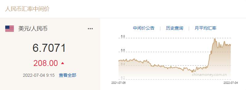 中新網(wǎng)7月4日電 中國人民銀行授權(quán)中國外匯交易中心公布,2022年7月4日銀行間外匯市場人民幣匯率中間價為1美元對人民幣6.7071元。這較上一交易日下調(diào)208個基點。(中新財經(jīng))