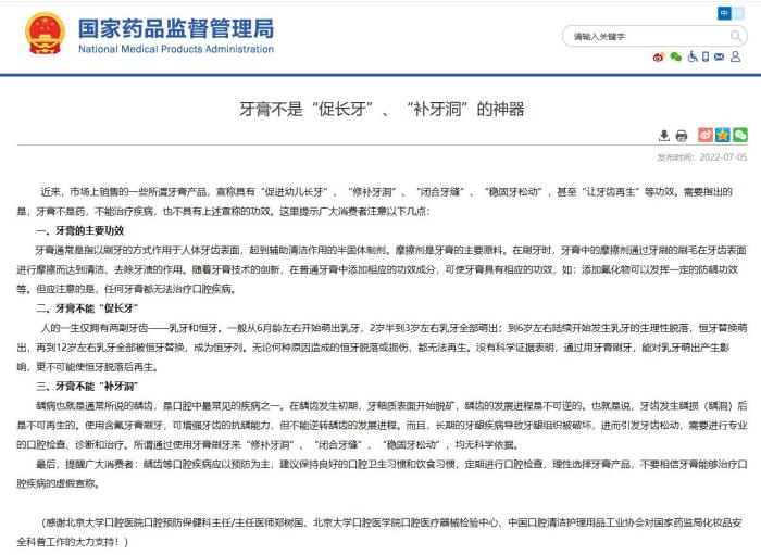 國(guó)家藥監(jiān)局:牙膏不是“促長(zhǎng)牙”、“補(bǔ)牙洞”的神器