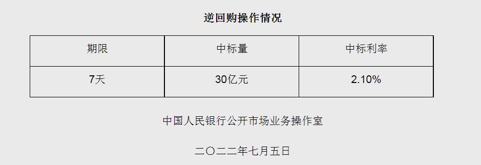 央行7月5日開展30億元逆回購(gòu)操作 中標(biāo)利率2.10%