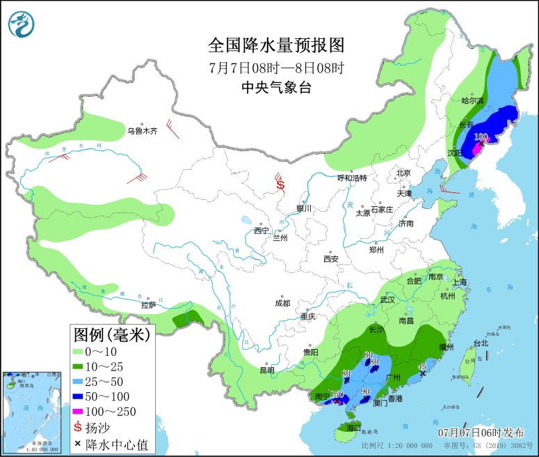 7月7日08時至8日08時,遼寧東部、吉林中東部、黑龍江東部、廣西中東部、廣東西部和東南部等地有大到暴雨,其中,吉林東南部、廣西東南部等地的部分地區(qū)有大暴雨(100~180毫米)。內(nèi)蒙古西北部、新疆東部和南疆盆地等地部分地區(qū)有5~7級風。黃海北部海域?qū)⒂?~8級、陣風9級的偏南風轉(zhuǎn)5~6級、陣風7級的偏西風,渤海將有4~6級、陣風7級的偏北風轉(zhuǎn)西南風。