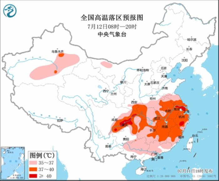 中央氣象臺7月12日06時繼續(xù)發(fā)布高溫橙色預(yù)警:預(yù)計7月12日白天,新疆南疆盆地、陜西南部、黃淮南部、西南地區(qū)東部、江漢、江淮、江南、華南等地有35℃以上高溫天氣,其中,安徽、江蘇中南部、上海、湖北西部和東南部、湖南北部和東部、江西、浙江、福建大部、四川盆地東南部、重慶、貴州東北部等地的部分地區(qū)最高氣溫37~39℃,江蘇南部、上海北部、浙江南部、四川盆地東南部、重慶中西部和北部局地可達40℃以上。